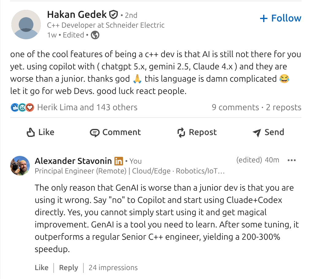 The current debate around GenAI and C++ is a good illustration of the real problem. Many engineers report that models are worse than juniors. Others report dramatic speedups on the same language and problem space. Both observations are correct.